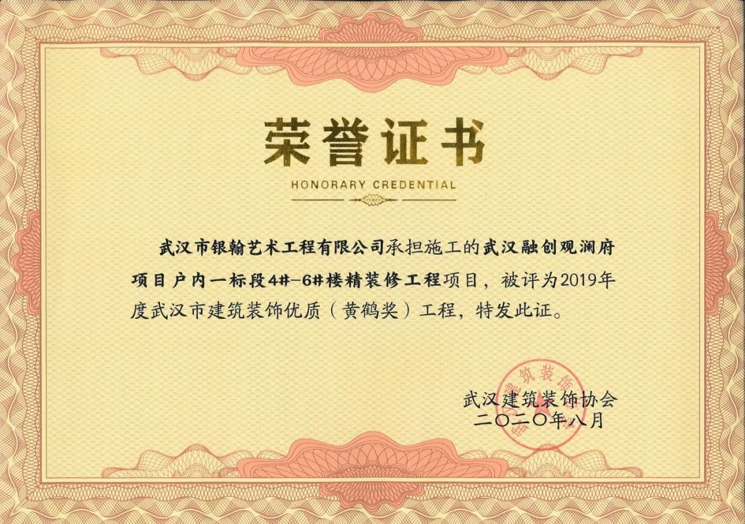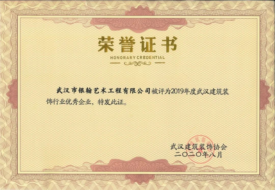 近日,武汉建筑装饰协会发布《关于表彰2019年度武汉建筑装饰行业优秀企业、 优秀企业家(经理)、 建造师(项目经理)、 设计师和建筑装饰优质(黄鹤奖)工程的决定,协会公示了表彰名单并颁发获奖证书,武汉市银翰艺术工程有限公司荣获多项荣誉: