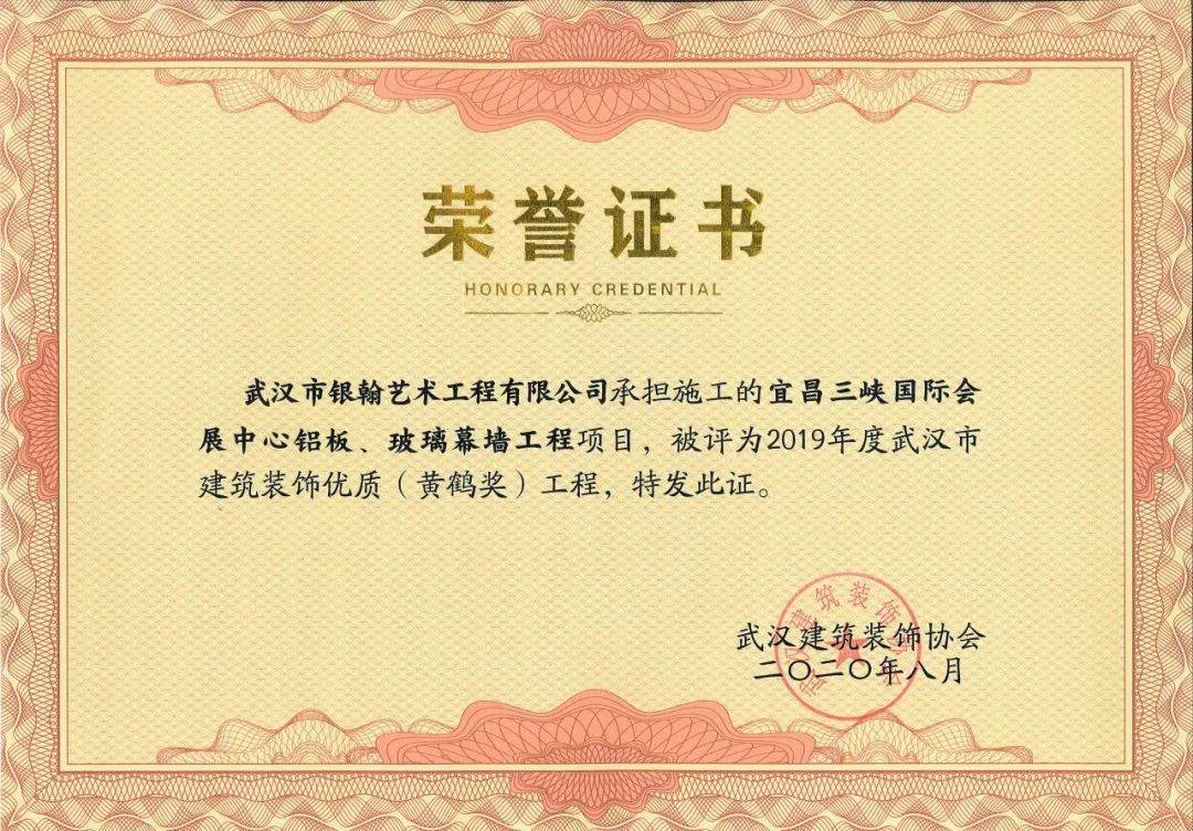 我司承担施工的宜昌三峡国际会展中心铝板、玻璃幕墙工程项目荣获2019年度武汉市建筑装饰优质(黄鹤奖)工程