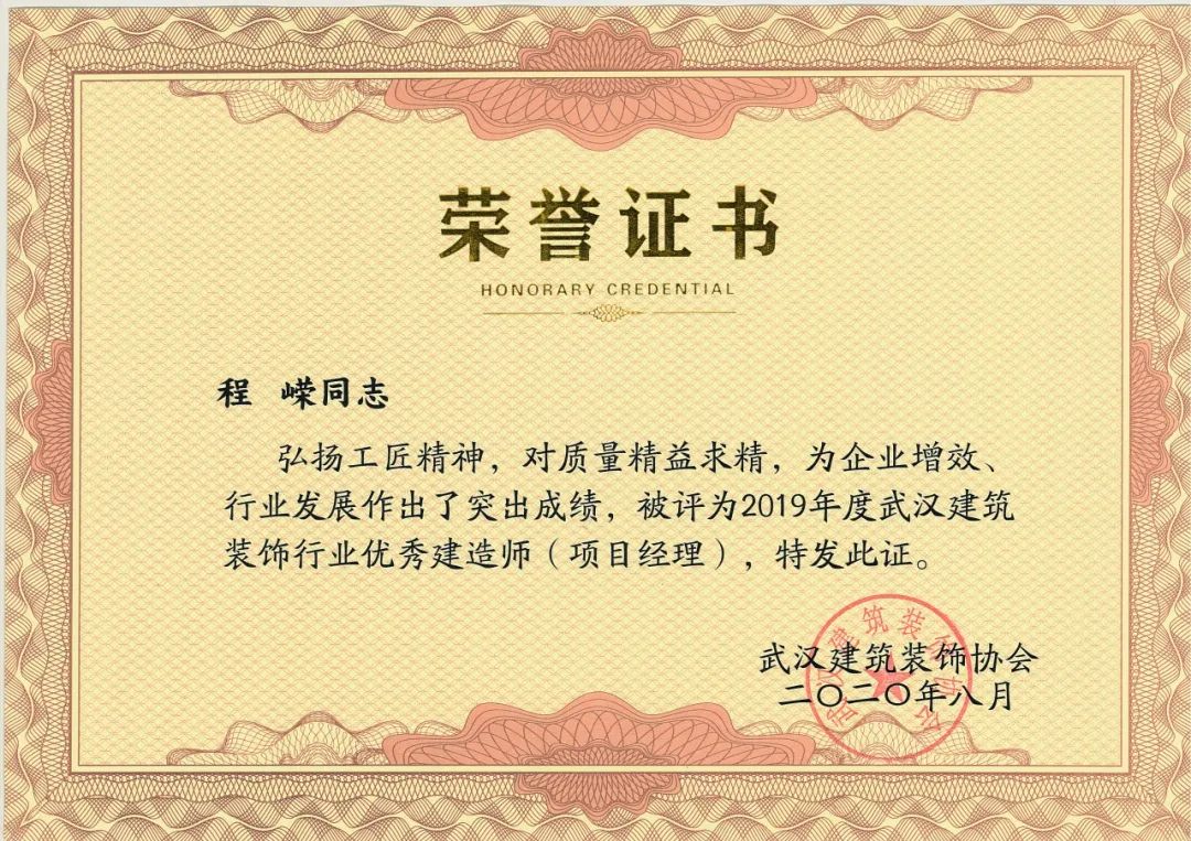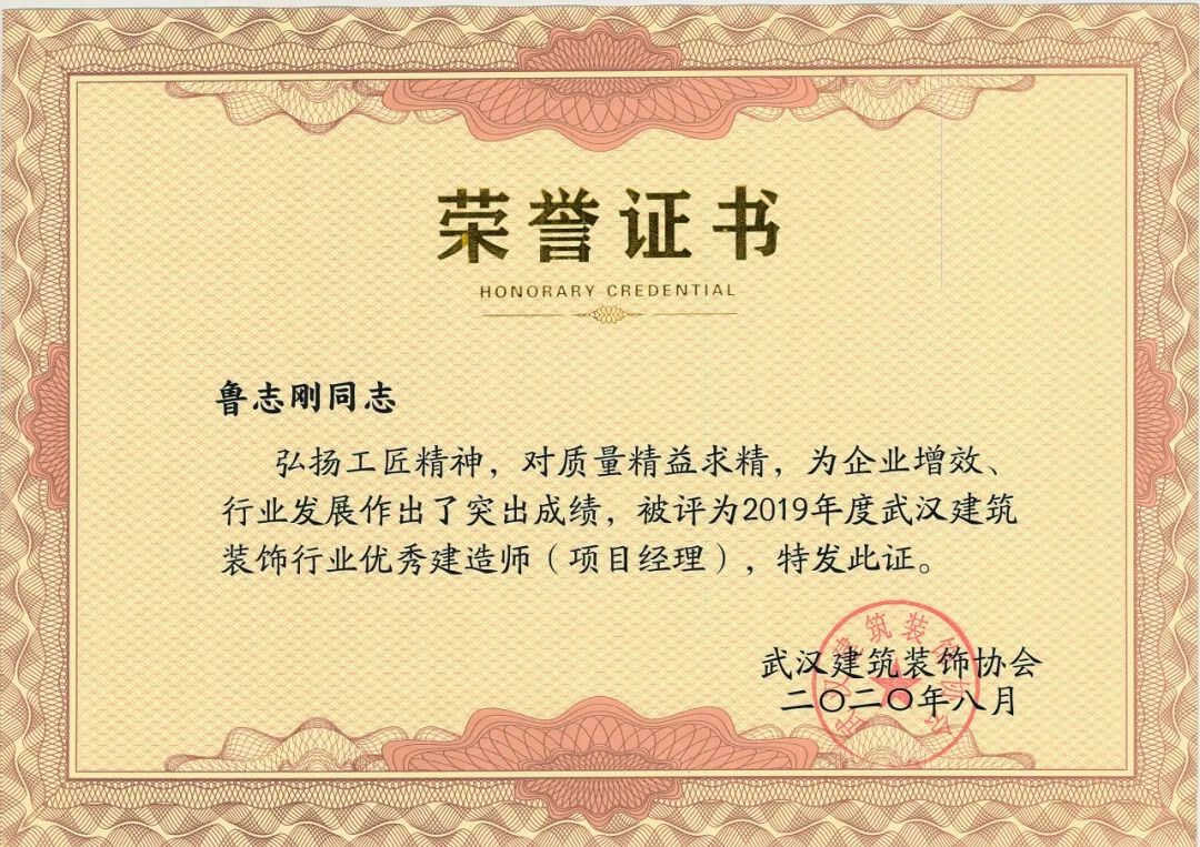 我司曹巍、鲁志刚、程嵘、齐褀被评为2019年度武汉建筑装饰行业优秀建造师
