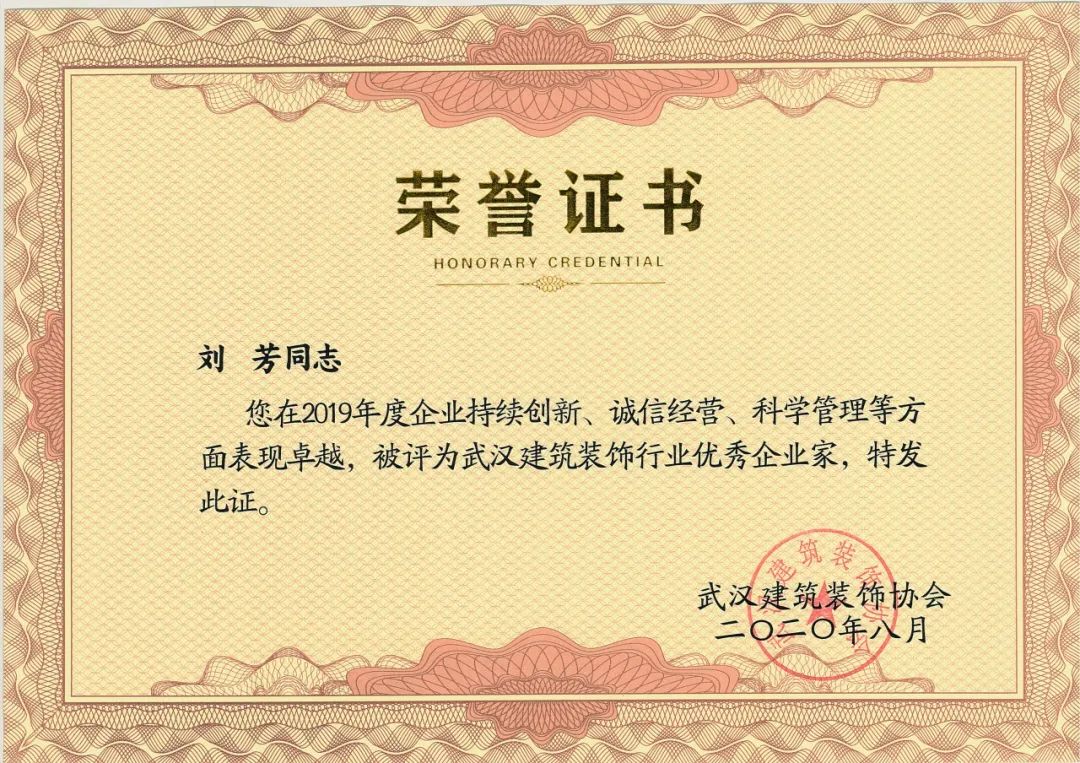 公司总经理刘芳荣获武汉建筑装饰行业优秀企业家称号