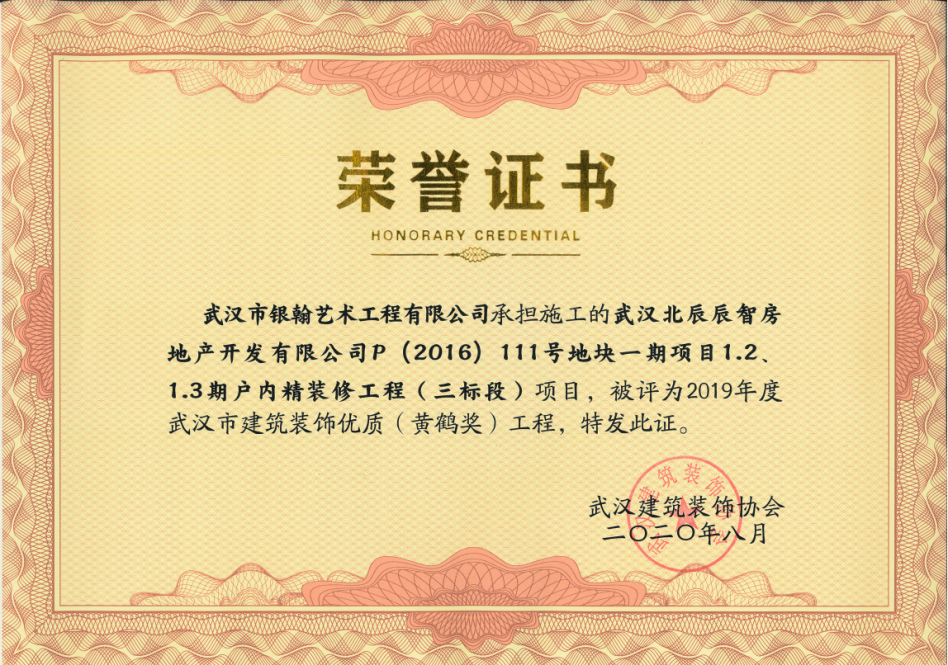 近日,武汉建筑装饰协会发布《关于表彰2019年度武汉建筑装饰行业优秀企业、 优秀企业家(经理)、 建造师(项目经理)、 设计师和建筑装饰优质(黄鹤奖)工程的决定,协会公示了表彰名单并颁发获奖证书,武汉市银翰艺术工程有限公司荣获多项荣誉: