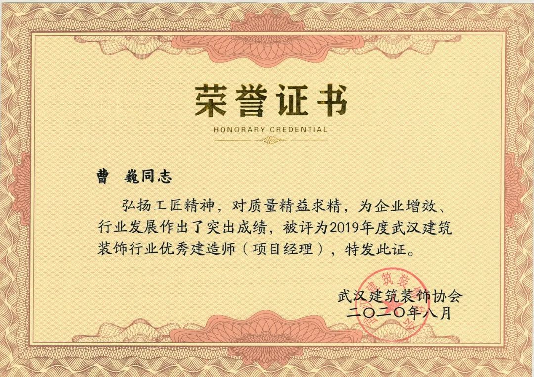 我司曹巍、鲁志刚、程嵘、齐褀被评为2019年度武汉建筑装饰行业优秀建造师